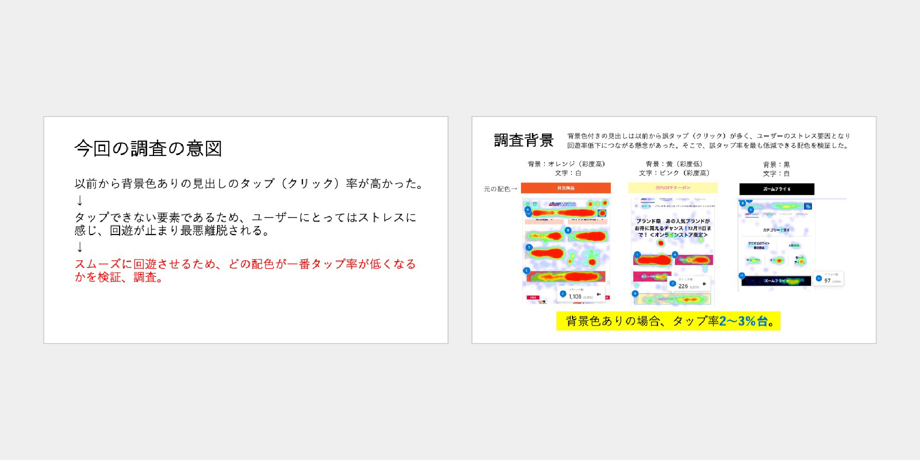 スポーツ用品ECサイトのランディングページにおいて、ユーザーの誤タップを減らすことを目的に、見出しデザインの改善を行いました。ヒートマップデータをもとに課題を特定し、UI変更と効果検証までを担当しています。