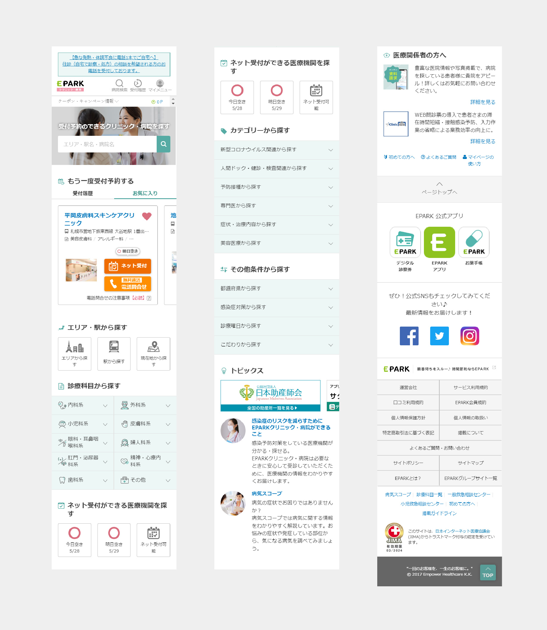 病院検索・予約サービス「EPARKクリニック・病院」において、UI改善を目的としたデザインリニューアルのSPトップページ担当。既存のデザインガイドラインを踏襲しながら、ユーザーが迷わず予約まで進める導線設計を行っています。