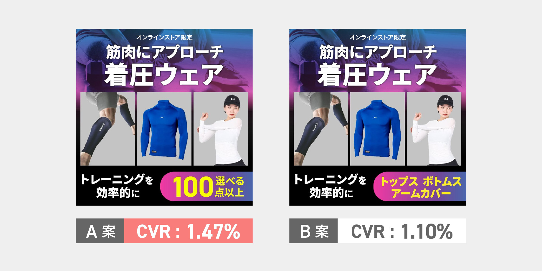テスト内容:【A】選べる100点以上(商品点数訴求) vs 【B】トップス、ボトムス、アームカバー(パーツ種類別訴求)