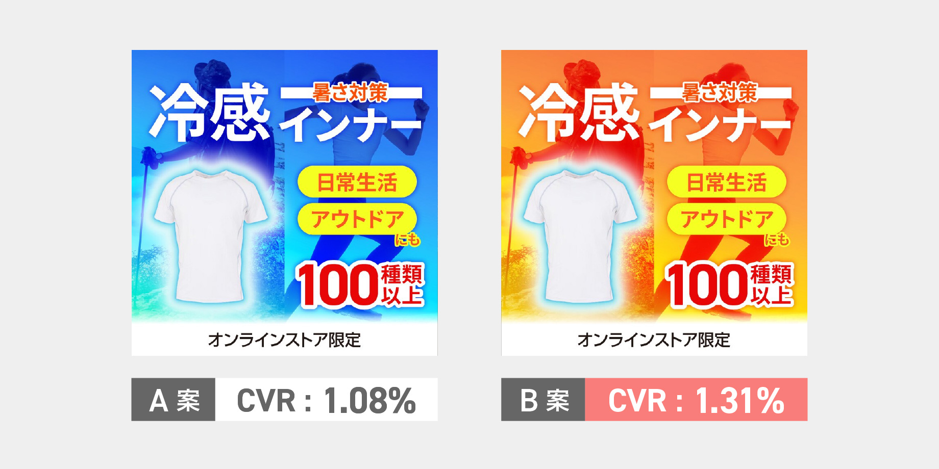 結果考察:暖かい=赤・オレンジを使いがちだが、Bの勝利となった。この事例の配色では、外気を寒色系の配色で商品周りの配色を暖色系にしたことで、発熱・保温効果を伝えられた。一般的に発熱・保温系ウェアは暖色系が多いため、他社と差別化を図る意味で寒色系にするのが効果的かと考える。