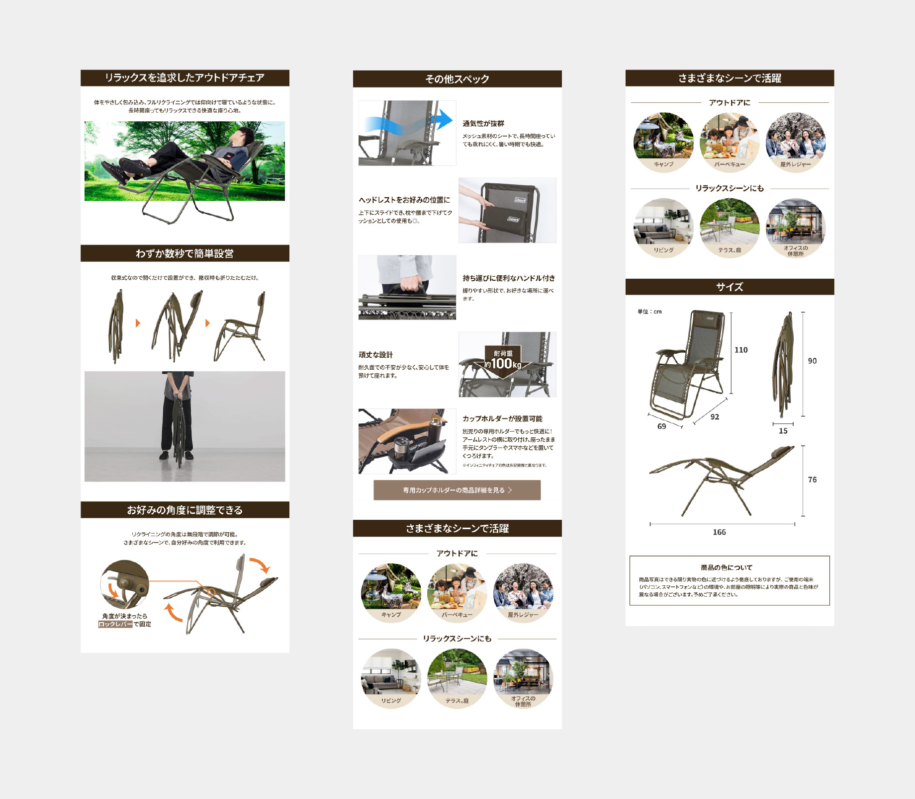 冒頭では使用シーンを想起させるため、キャンプ場のイメージ画像を背景に、椅子に座るモデル写真を重ねて配置。また、簡単に設置できる点も商品の強みであることから、設置方法を動画で掲載し、使用イメージと操作性の伝達を図った。
