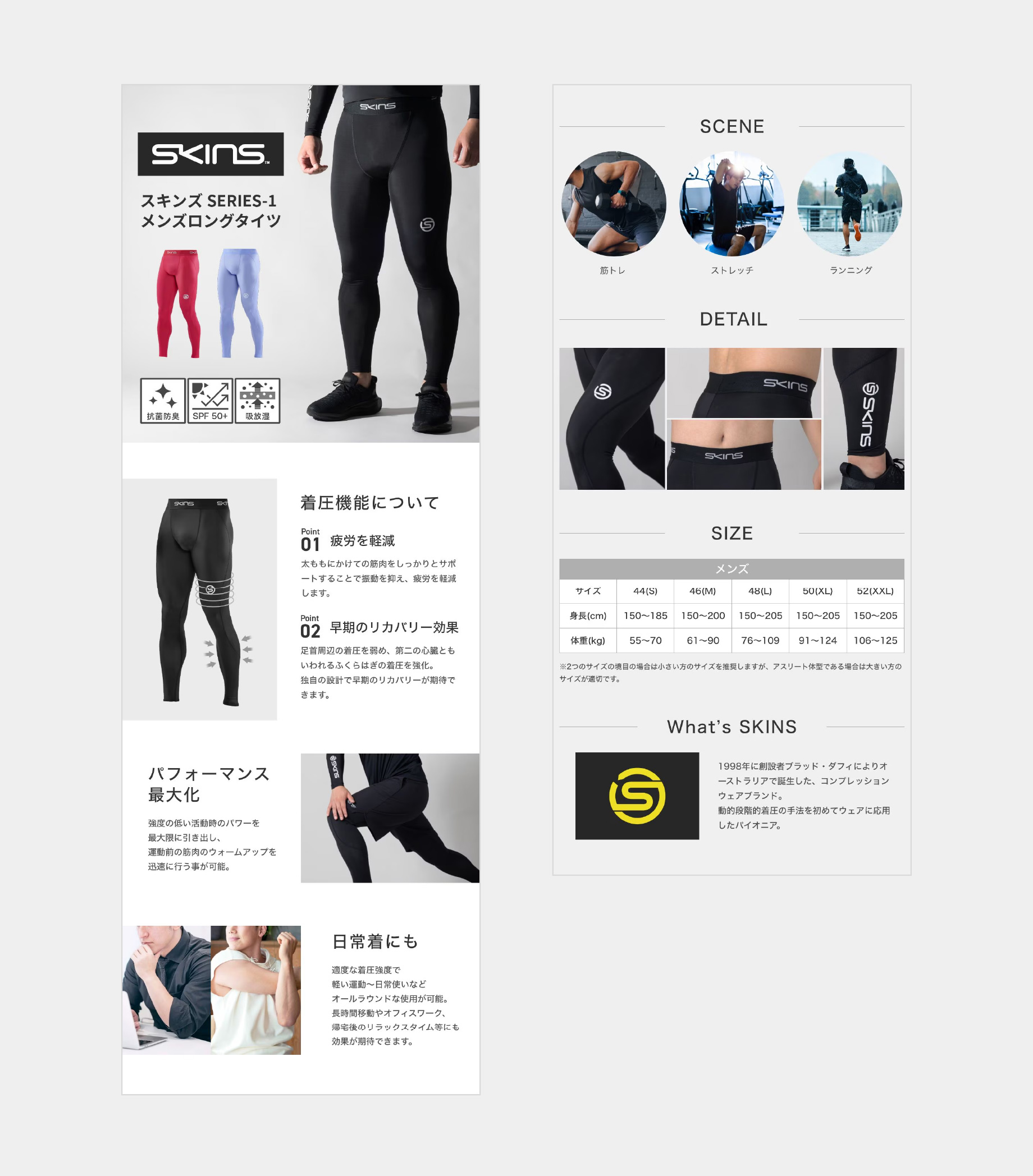 日常着としての利用シーンを広げるため、疲労軽減・リカバリー効果を中心に訴求。あわせて、サイズ選びの迷いを防ぐため、サイズ表に注釈を追加しジャストサイズ選択をサポートした。