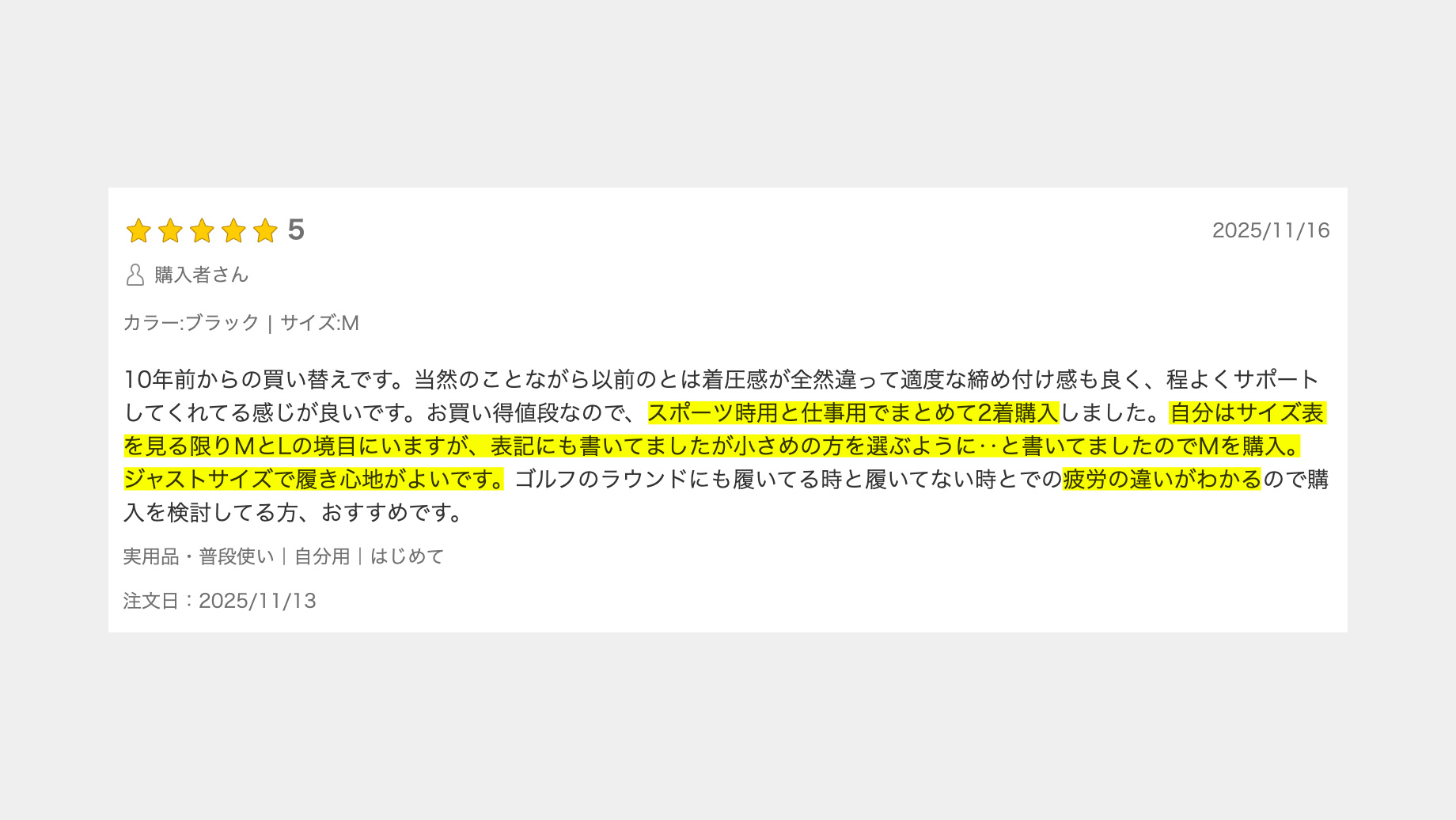 通年利用される商材であることから、短期的な売上変化も改善効果として評価可能と判断。レビューでは、日常用でも購入し、リカバリー効果を実感。さらにサイズ表の注釈を参考にジャストサイズを選べたとの声があり、狙い通りの反応を確認できた。
